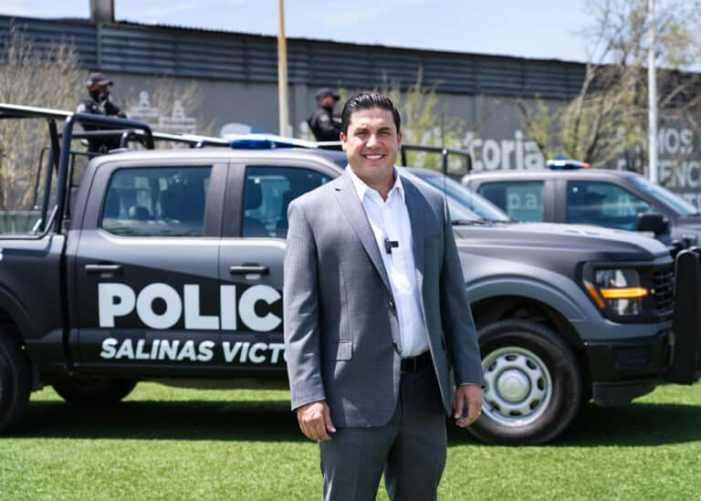 Para festejar su cumpleaños 38 con la ciudadanía, el alcalde de Salinas Victoria, Raúl Cantú de la Garza, encabezó la entrega de 12 patrullas y